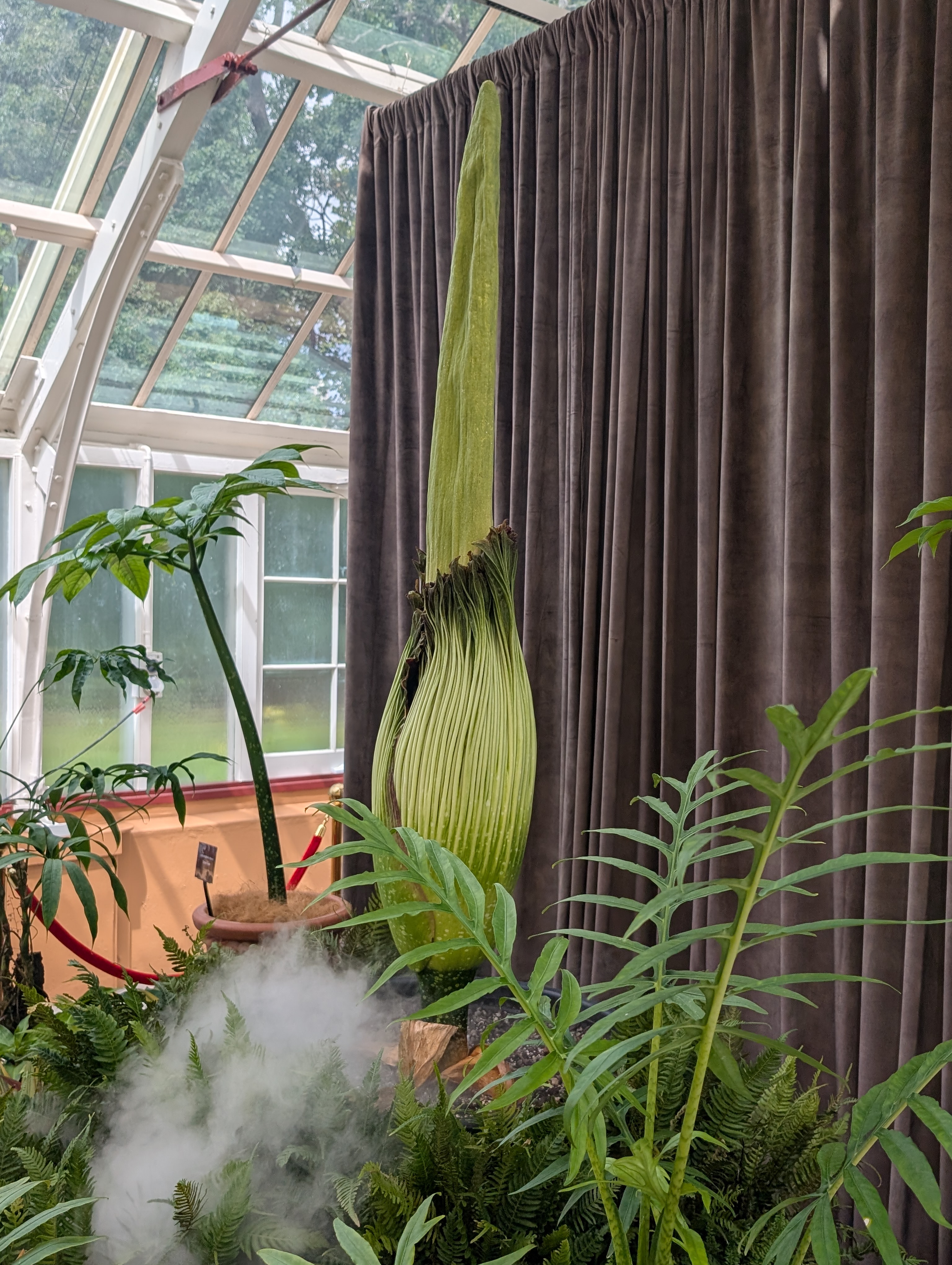 After waiting in a short queue outside the greenhouse, I was escorted with a couple of dozen folks inside, where "Putricia," was putting on her show. The Corpse Flower, native to Western Sumatra, only blossoms every few years because of the tremendous energy the giant flower consumes, and then it only lasts for twenty-four hours. The name comes from the deathly odor the blossom emanates to attract beetles and flies to pollinate the plant. Putricia wasn't blooming yet when I was there, and there was no smell, but the blossom stalk was on full display and ready to unfold. In fact, I found out later that it bloomed the very next day!
