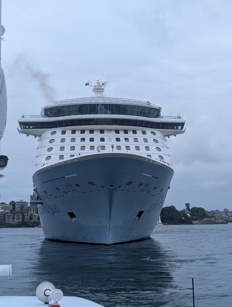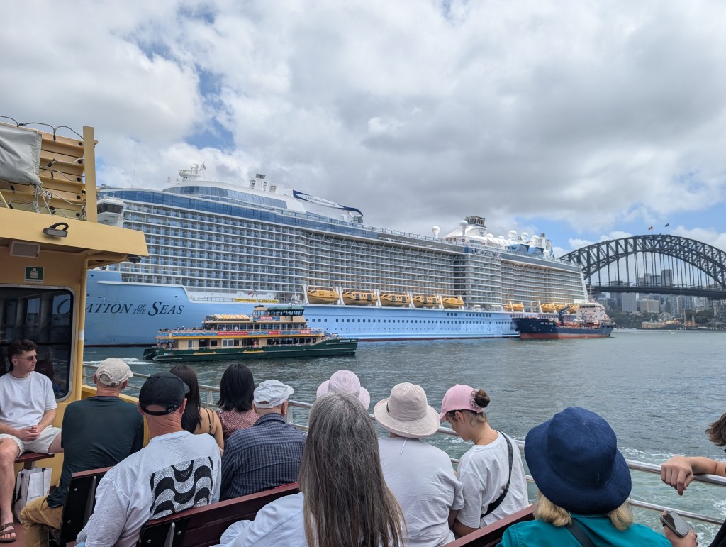 I made the most of the public transportation AND my legs over the next couple of days. Thursday morning, after breakfast and goodbyes with Cherie and Bernie, I jumped on the Crows Nest Metro Station and rode it to Barangaroo, on the other side of the harbor. I emerged in the historic "The Rocks" neighborhood in the shadow of the Harbor Bridge, and made my way along the water to the Circular Quay, which is the major transportation hub for Sydney's trams and water ferries. Just before I reached the Quay there was a cruise ship loading on a nearby pier. This thing was gigantic! It made the Titanic look like a ship for ants. It truly was a city on the water. I couldn't imagine being trapped on the ocean in one of those behemoths, surrounded by thousands of vacationers. Add that to the list of my worst nightmares!