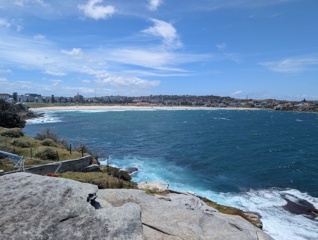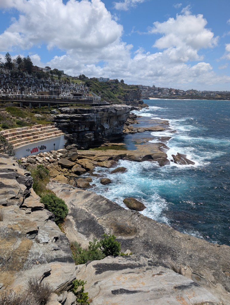 Friday was mostly walking and beaches. I took a ride-share from John's house in North Sydney to Coogee Beach in SE Sydney. After powering up with some strong coffee, I jumped on the pedestrian coastal trail and headed North. The path goes for miles, and wends up and down stairs, along cliffs, through a fantastic cemetery, and past at least a half-dozen white sand beaches tucked back in coves along the way. It was one heck of a workout, and worth every step. I took a couple of swim breaks over the course of the walk, and grabbed a cold beer and some nachos at my destination in Bondi before jumping on the bus (make that bus+tram+bus) and heading home.
